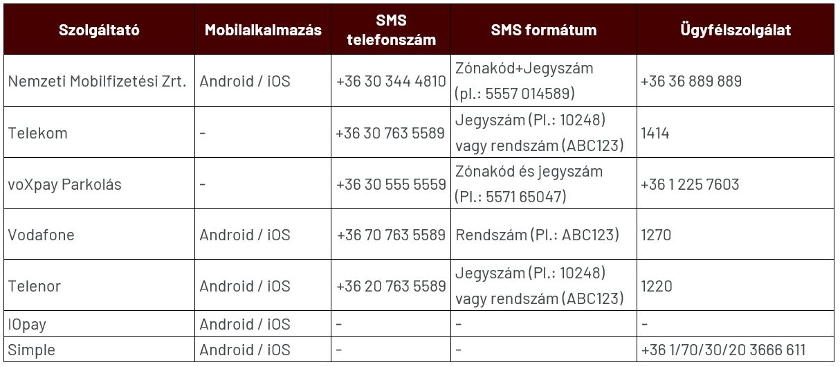 Az SMS formátuma szolgáltatóként eltérő a táblázat szerint. A Vodafone rendszere csak rendszámot fogad el, így az esetben, ha behajtáskor a rendszámfelismerő nem rögzítette a jegyre a rendszámát, sajnos nem fogja tudni a díjat kifizetni ezen szolgáltatás keretein belül.